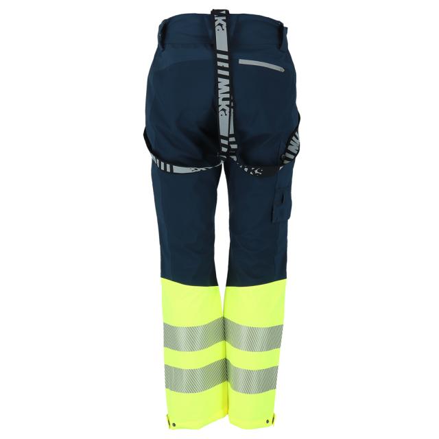 Husky Shell Pant High Vis er en vanntett og ventilerende bukse fylt med detaljer som trengs for en håndverksbukse. Formsydd fasong med elastisk linning, avtagbare stropper og hemper for belte. Buksen har formsydde knær med tynn padding. Flere lommer i front og bak - alle med glidelås. Lang toveis glidelås fra ankel til midt på lår med kile og reguleringsmuligheter ved ankel. Lomme til meterstokk/kniv på høyre lår. 7cm brede refleksbånd rundt ankel og fluoriserende materiale for synlighet. Kl. 1.