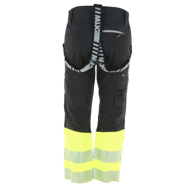 Husky Shell Pant High Vis er en vanntett og ventilerende bukse fylt med detaljer som trengs for en håndverksbukse. Formsydd fasong med elastisk linning, avtagbare stropper og hemper for belte. Buksen har formsydde knær med tynn padding. Flere lommer i front og bak - alle med glidelås. Lang toveis glidelås fra ankel til midt på lår med kile og reguleringsmuligheter ved ankel. Lomme til meterstokk/kniv på høyre lår. 7cm brede refleksbånd rundt ankel og fluoriserende materiale for synlighet. Kl. 1.