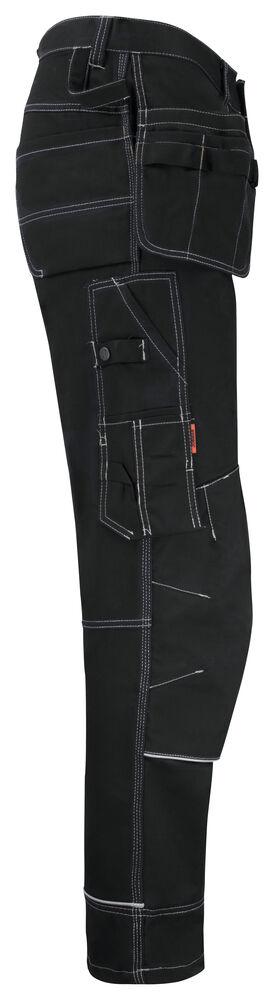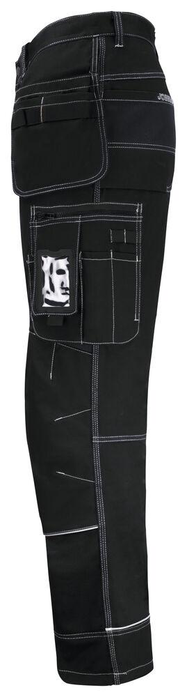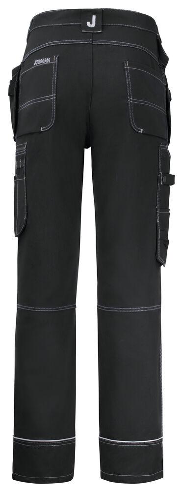 Forsterkede detaljer som baklommer og tommestokklomme. Romslige hengelommer som kan puttes i frontlommene. Romslige frontlommer. Baklommer med forsterket innside. Hammerhank. Ekstra beltehemper på de største størrelsene. Tommestokklomme med knivholder. Benlomme med glidelås, mobiltelefonlomme, ID-kortholder og ekstra rom. Forbøyde knær for optimal passform. Knebeskyttelseslommer i slitesterkt polyamid med refleksbiser og to posisjoner for knebeskytterne. Forsterket benkant i polyamid som ikke absorberer fukt. Refleksbise og innstramming i benavslutning. Sertifisert ifølge EN 14404:2004+A1:2010 type 2, nivå 1 sammen med Jobmans knebeskytter 9943, 9944 og 9945.