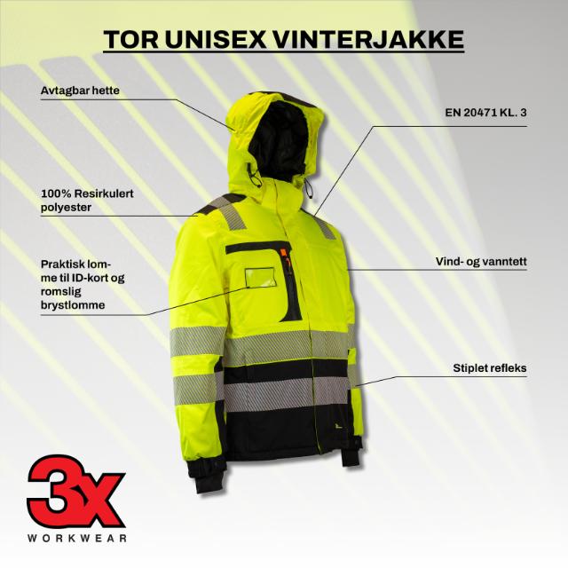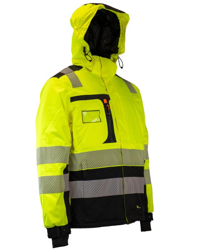 Foret vinterjakke synlighet klasse 3. Laget i stetchmateriale og funksjonelt design. Vannsøyle 20.000mm, 8000mm pustende. To frontlommer med glidelås, brystlomme høyre side med vanntett glidelås, id-kort lomme høyre side i brystlomme. Brystlomme venstre side med glidelås under klaff. En innvendig lomme høyre side med glidelås. Avtakbar hette med glidelås. Lufting under arm. Elastisk strammesnor i linning. Pulsvarmer i erme. Nakkehempe. Tilpasset for profilering.