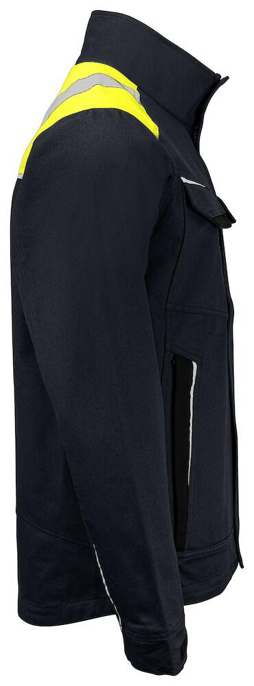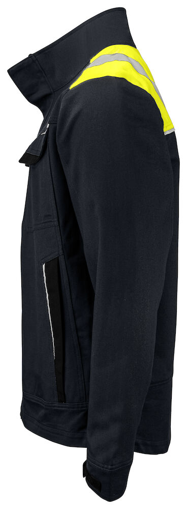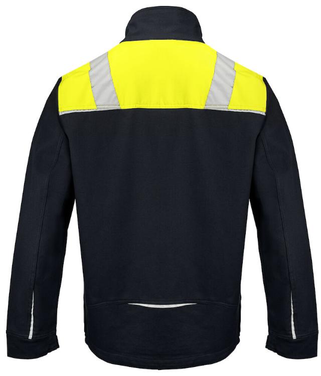 Servicejakke med glidelås opp i kragen i front, med innvendig vindklaff for å hindre trekk, samt hakebeskyttelse for å forhindre gnagsår. Fleecefôr i kragen gir god komfort. Brystlommer, i venstre brystlomme er det et indre feste for ID-kort. Sidelommer med glidelås. Romslige innerlommer, også en innvendig telefonlomme som lukkes med borrelås. Forlenget i ryggen. Justerbare mansjetter med borrelås. Fluorescerende stoff og reflex over skuldrene gir økt synlighet. Kommer også med reflekspiping i nederkant rygg og på lommer i front.
