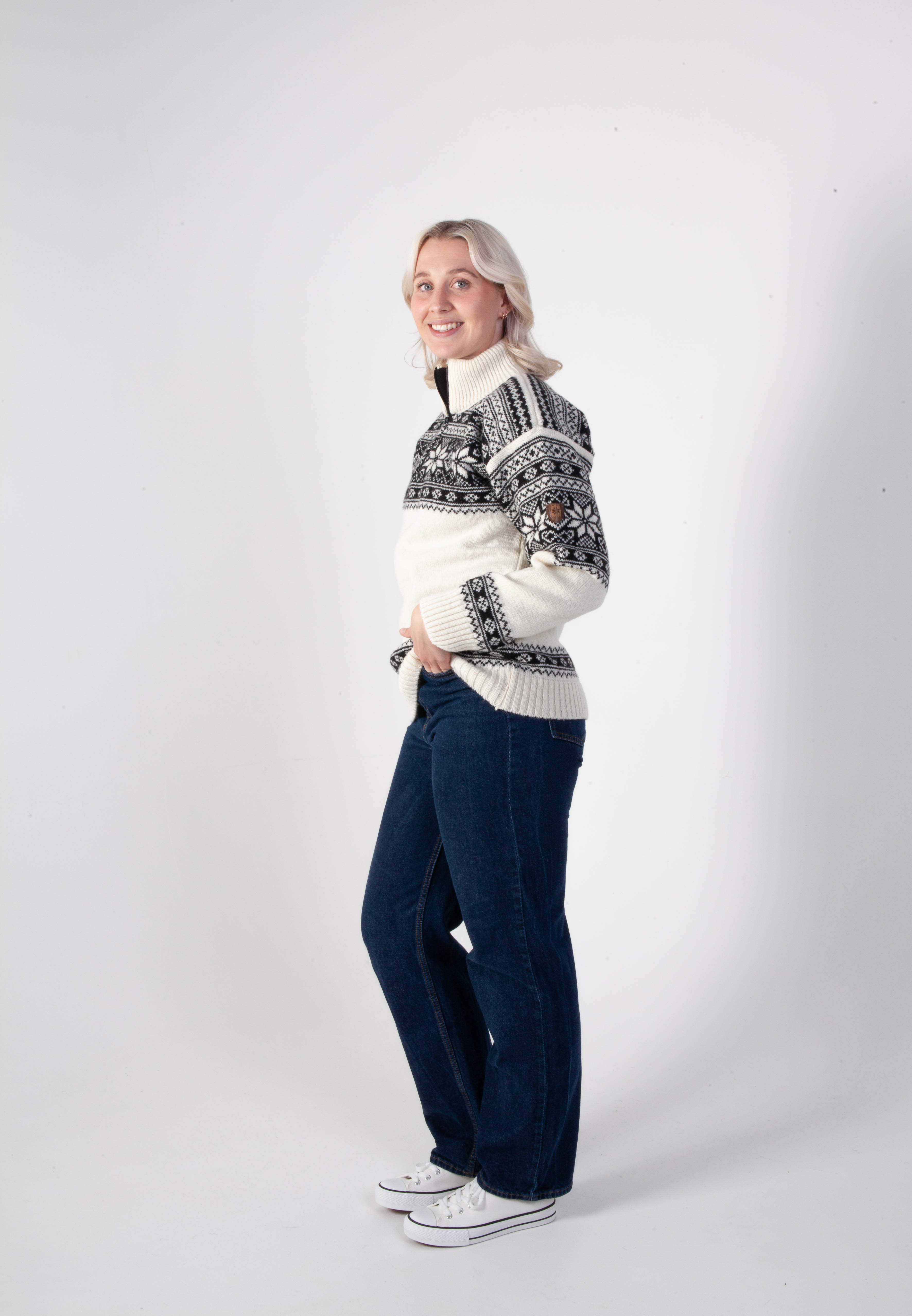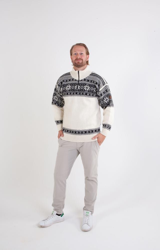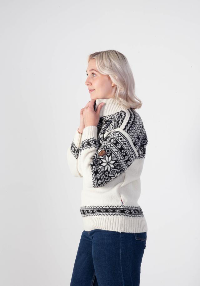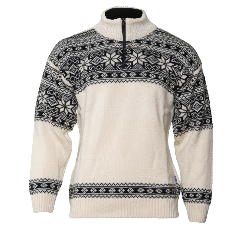 Snøstjerne-genseren er en varm ullgenser laget av 100 % norsk ull. Genseren har høy hals med glidelås og behagelig fleecefôr inni halsen. Mønsteret har vært brukt i tradisjonell norsk strikking i lang tid. Historien går helt tilbake til 1800-tallet. Vi har laget vår vri av det vakre mønsteret på Snøstjerne-plaggene inspirert av det gamle strikkemønsteret. Unisex modell basert på herrestørrelse, anbefaler damer å gå ned en størrelse enn det man vanligvis bruker.