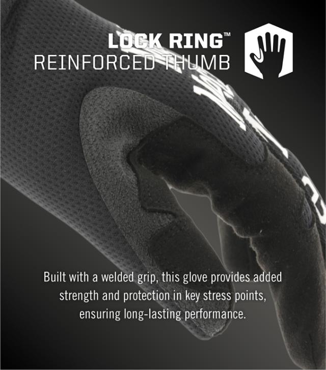 - Welded Lock Ring™ grip thumb panel design wraps high wear thumb saddle area increasing durability and reducing vulnerable stitching.
