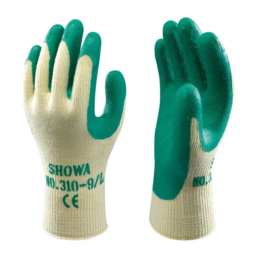 Halvdypet, sømløs Showa-hanske med ribbet krage. Bomulls/polyesterhanske med Crepe-overflate og lateksbelegg. Ideell for hagebruk, skogbruk, resirkulering og byggearbeid. Godkjenninger: EN 388:2003 og EN 420:2003+A1:2009. Kategori II. Bomull/latex/polyester Halv dyppet