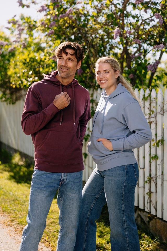 Klassisk unisex hettegenser i 80% økologisk bomull og 20% resirkulert polyester. GOTS-sertifisert CU 1298291. Dobbel jerseystrikket, flosset innside, forsterkede sømmer. Dobbel hette med snøring. Stikklomme i front.  Modellen har en litt smalere passform enn 3851 Harlem.
