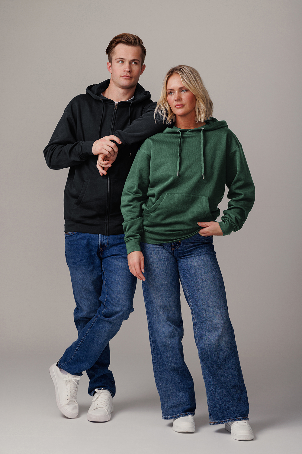 Klassisk unisex hettegenser i 80% økologisk bomull og 20% resirkulert polyester. GOTS-sertifisert CU 1298291. Dobbel jerseystrikket, flosset innside, forsterkede sømmer. Dobbel hette med snøring. Stikklomme i front.  Modellen har en litt smalere passform enn 3851 Harlem.