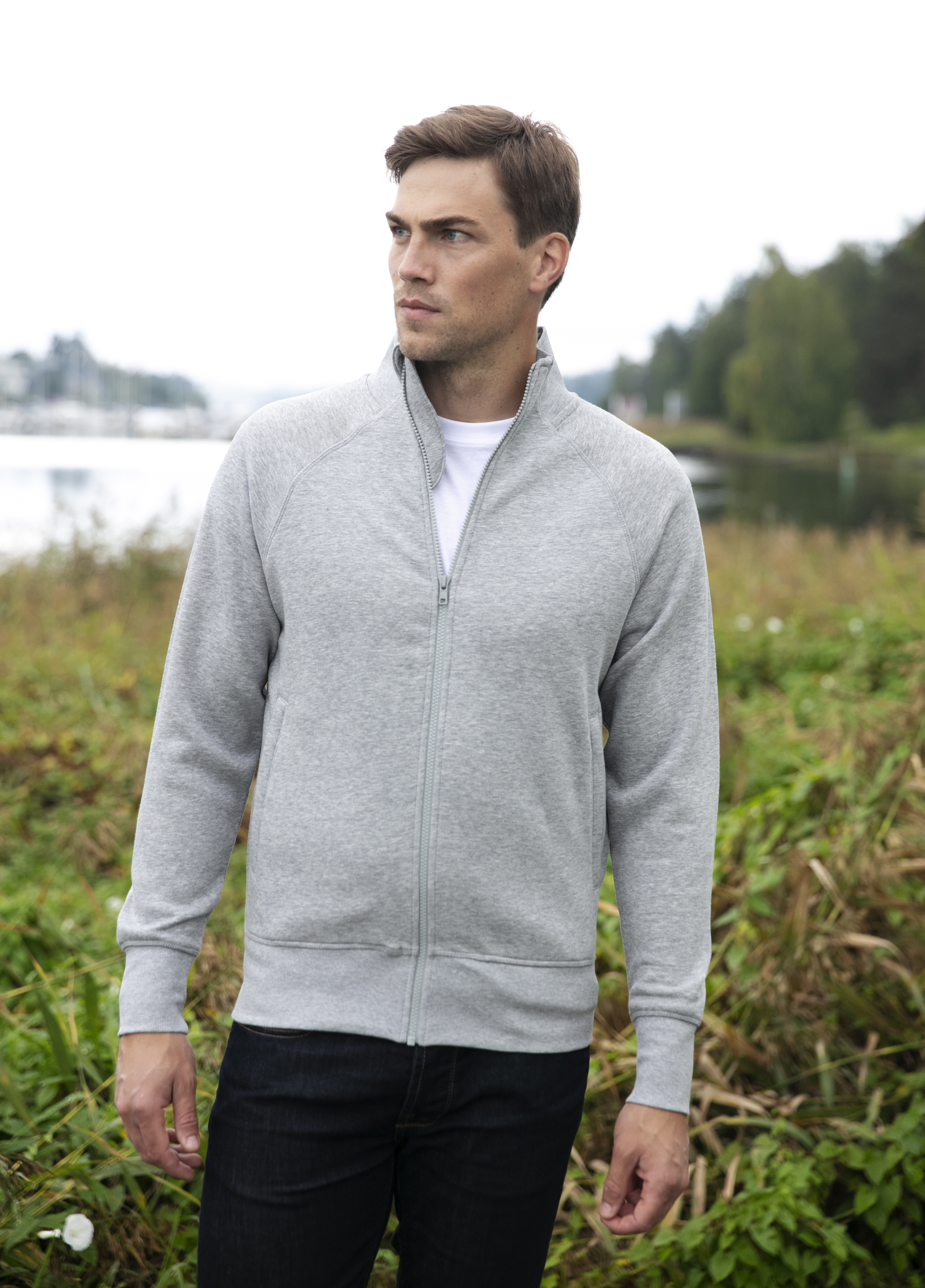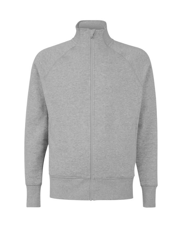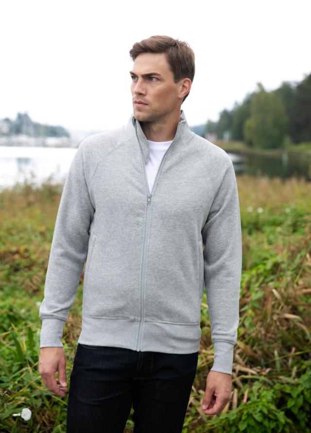 Denne klassiske sweatshirt-jakken uten hette er laget i en kraftig og behagelig kvalitet som gir både komfort og slitestyrke. Den har en hel ton-i-ton YKK-glidelås i front og to praktiske sidelommer, også med YKK-glidelås, som gjør det enkelt å oppbevare småting trygt. Jakken er utstyrt med strikket krage og raglan-ermer som gir god bevegelighet, samt en flosset innside som føles myk mot huden. Det forsterkede nakkepartiet sørger for ekstra holdbarhet, mens ribb i mansjetter og nederkant gir en god passform. Jakken er produsert i BCI-sertifisert bomull, noe som gjør den til et mer bærekraftig valg.