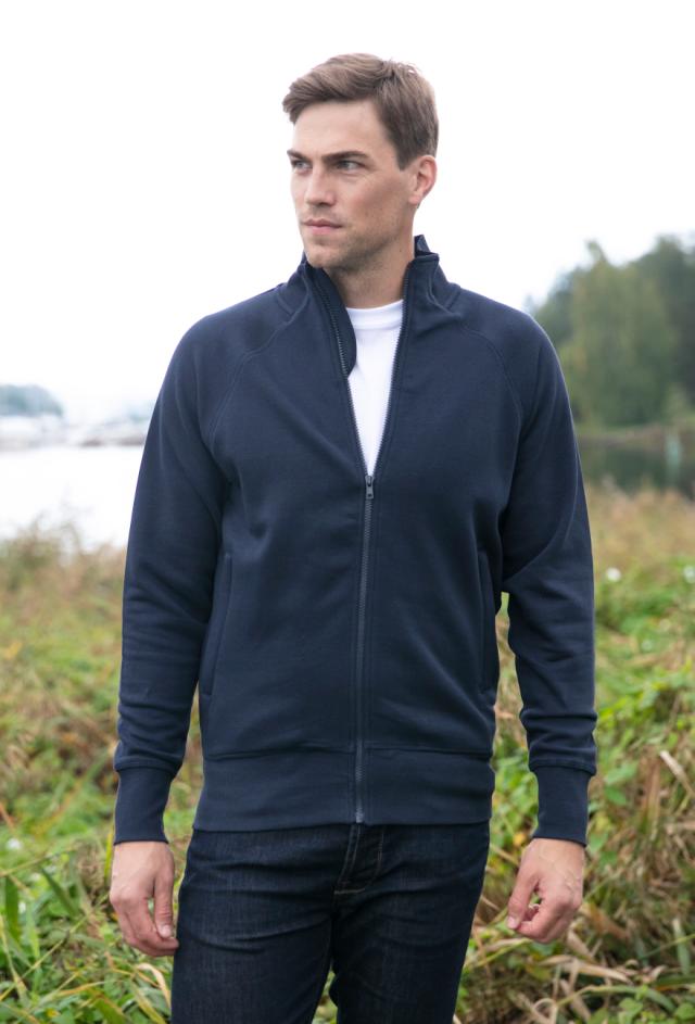 Denne klassiske sweatshirt-jakken uten hette er laget i en kraftig og behagelig kvalitet som gir både komfort og slitestyrke. Den har en hel ton-i-ton YKK-glidelås i front og to praktiske sidelommer, også med YKK-glidelås, som gjør det enkelt å oppbevare småting trygt. Jakken er utstyrt med strikket krage og raglan-ermer som gir god bevegelighet, samt en flosset innside som føles myk mot huden. Det forsterkede nakkepartiet sørger for ekstra holdbarhet, mens ribb i mansjetter og nederkant gir en god passform. Jakken er produsert i BCI-sertifisert bomull, noe som gjør den til et mer bærekraftig valg.