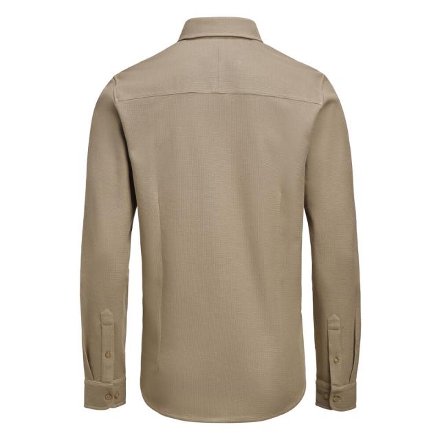 Hicksville er en moderne skjorte laget av et vaffelstrikket, strukturert stoff. Stoffet er laget av økologisk bomull og resirkulert polyester. Skjorten har en skjult button down-krage og ton-i-ton-knapper for et stilrent uttrykk.