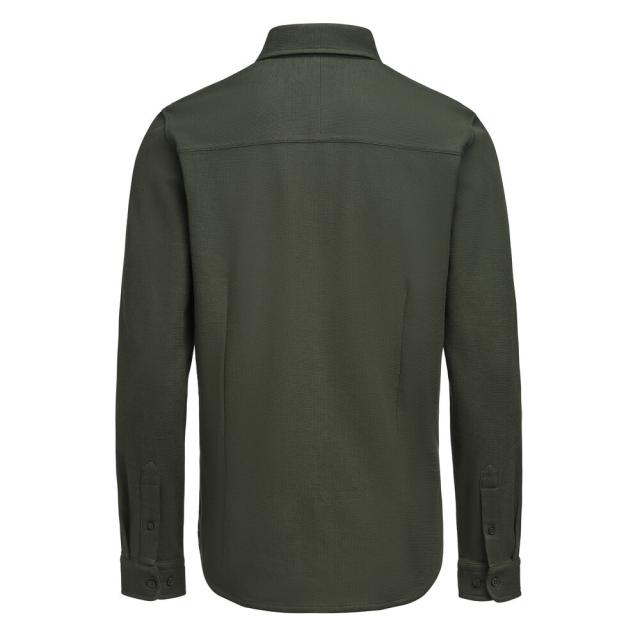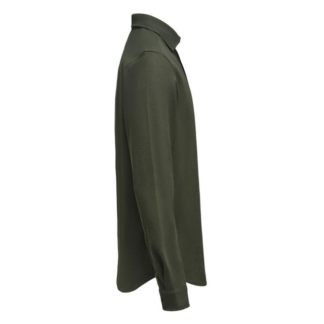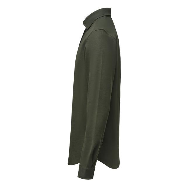 Hicksville er en moderne skjorte laget av et vaffelstrikket, strukturert stoff. Stoffet er laget av økologisk bomull og resirkulert polyester. Skjorten har en skjult button down-krage og ton-i-ton-knapper for et stilrent uttrykk.