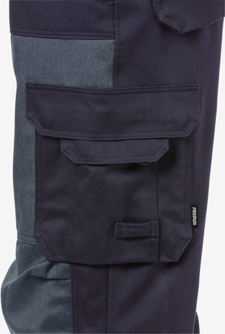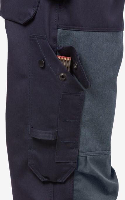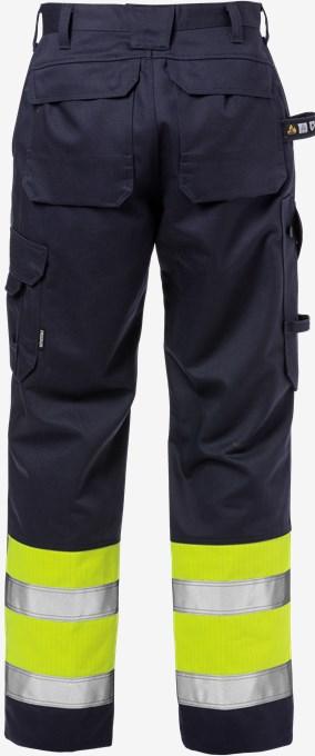 2 framlommer / 2 CORDURA®-forsterkede baklommer med klaff og skjult trykknapp / Dobbelt forsterket søm i skrittet / Hammerstropp / CORDURA®-forsterket tommestokklomme med klaff og skjult trykknapp, knapp og holder for kniv / Beinlomme med klaff og skjult trykknapp, telefonlomme med klaff og borrelås og D-ring og / CORDURA®-forsterkede knelommer med innvendig åpning / Høydejustering for kneputer i knelommer / Aramid-forsterkede lårpaneler / Aramid-forsterkede buksebein / Godkjent i henhold til EN 61482-1-2 klasse 1, EN 61482-1-1 ATPV 10,6 cal/cm² HAF 80,4% (se tabell for elektrisk lysbue, for sertifiserte plaggkombinasjoner for EN 61482-1-2 klasse 2 og åpen lysbue i henhold til EN 61482-1-1), EN ISO 11612 A1 B1 C1 E2 F1, EN ISO 11611 A1 klasse 1,(Se flamme- og sveisetabell for sertifiserte plaggkombinasjoner for EN 11612 C2, E3, F2 og EN 11611 A1 klasse 2) EN 1149-5, EN ISO 20471 klasse 1 og EN 14404 sammen med kneputer 124292 / Godkjent etter 50 vask / Vaskeritestet i henhold til ISO 15797 / Øko-Tex® sertifisert.