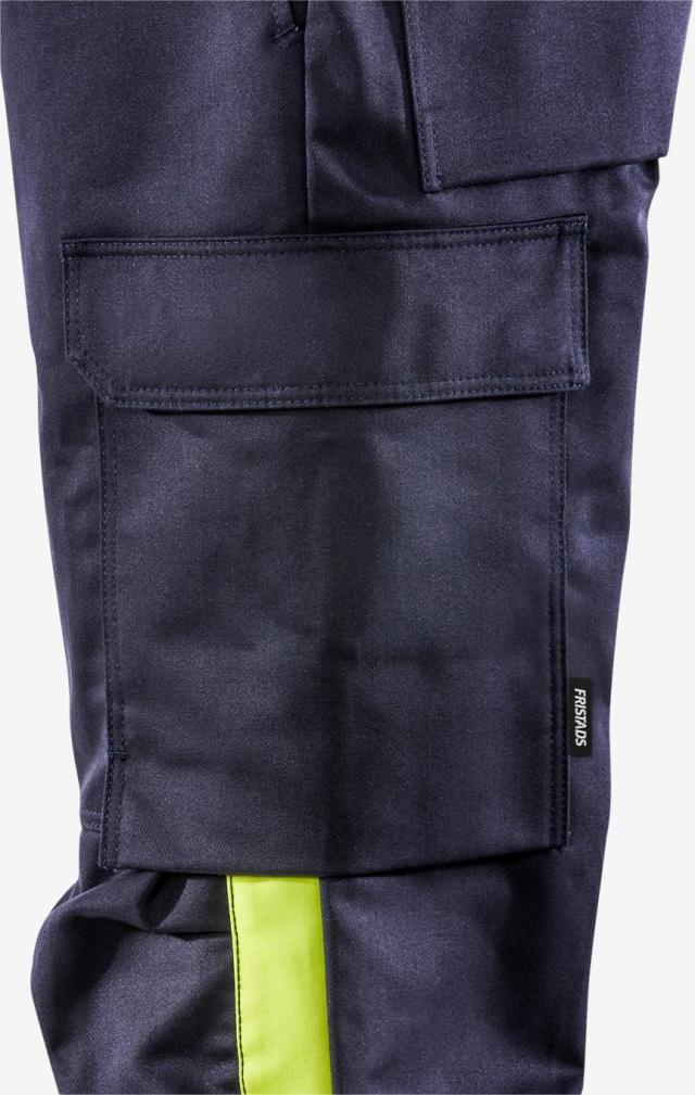 2 framlommer / 2 forsterkede baklommer med klaffer og skjult trykkknapp / Hammerstropp / Lårlomme med klaff og og skjult trykknapp, telefonlomme med klaff og borrelåsfeste, sløyfe for ID-kortholder / Forsterket sammenleggbar regellomme med klaff og skjult trykknapp, pennelomme og knapp og sløyfe for skjedekniv / Bøyde ben / Knelommer med innvendig åpning / Høydejustering for kneputer i knelomme / Godkjent i henhold til EN 61482-1-2 klasse 1, EN 61482-1-1 ATPV: 10,6 cal / cm² (se Elektrisk lysbue for sertifiserte plaggkombinasjoner for EN 61482-1-2 klasse 2 og for åpen lysbue i henhold til EN 61482-1-1), EN ISO 11612 A1 B1 C1 E2 F1, EN ISO 11611 A1 klasse 1 (se Flamme- og sveisetabell for sertifiserte plaggkombinasjoner), EN 1149-5 og EN 14404 sammen med kneputer 124292 / Godkjent etter 50 vask / Vaskeritestet i henhold til ISO 15797 / ØKO-TEX®-sertifisert.