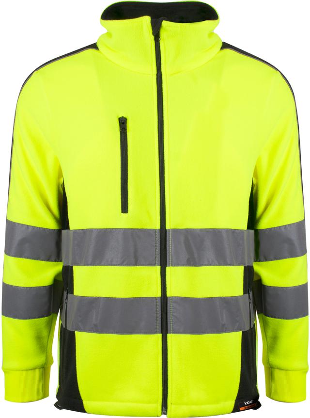 Tofarget unisex fleecejakke med kontrastfelt i siden, ermer og krage. Påsydde reflekser rundt midje og skuldre. Reflekspiping langs ermer. YKK glidelås i front. Glidelåslommer i front og brystlomme med glidelås. Mediaport i lomme. CE-merket. EN 20471, klasse 3.
