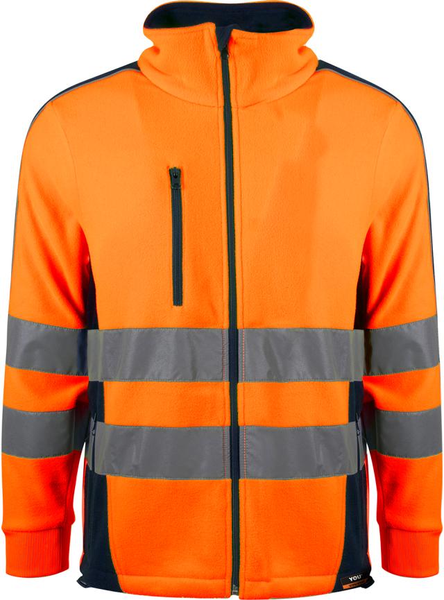 Tofarget unisex fleecejakke med kontrastfelt i siden, ermer og krage. Påsydde reflekser rundt midje og skuldre. Reflekspiping langs ermer. YKK glidelås i front. Glidelåslommer i front og brystlomme med glidelås. Mediaport i lomme. CE-merket. EN 20471, klasse 3.