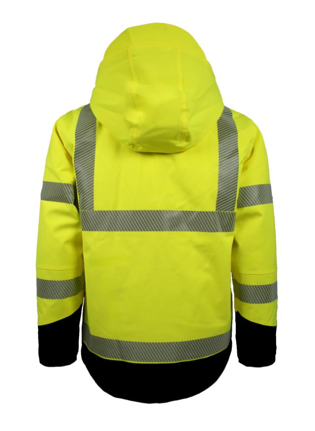 Med en skjult glidelås som er kombinert med borrelås, sikrer jakken god beskyttelse mot vær og vind. Den leveres med en avtakbar ID-kortholder for enkel tilgang til identifikasjon. Ermer med vindklaffer og borrelåsjustering ved ermene bidrar til å holde vinden ute, mens justerbar bunn med elastiske lisser gir mulighet for tilpasning.