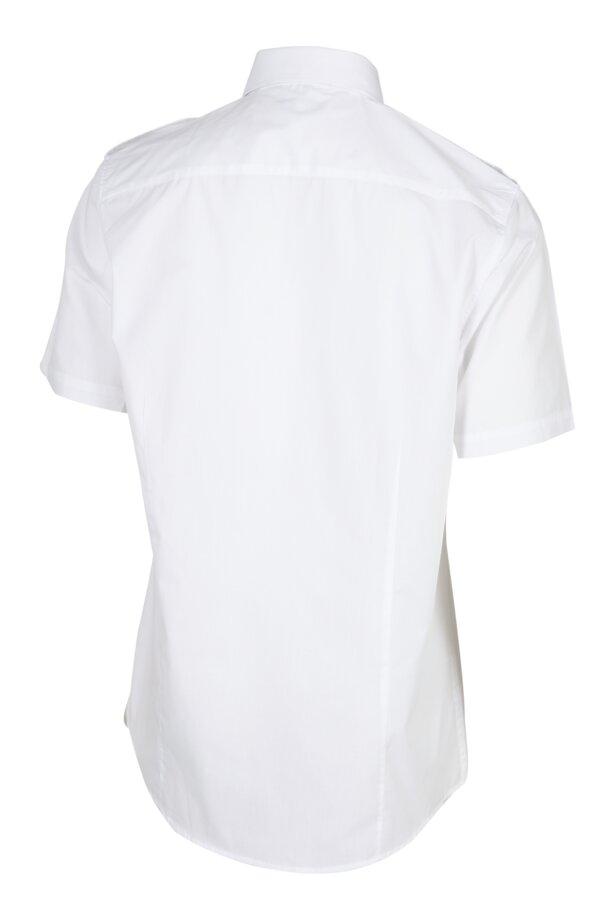Klassisk kortermet skjorte med spiss krage, skulderklaffer, knappestolpe foran, som lukkes med åtte knapper. Bærestykke bak, innsnitt nederst på ryggen, korte ermer med sydd nedkant. To brystlommer med klaff og knapper, og pennesøm på venstre lomme. Kontrastfarge på innsiden av krage og mansjett.