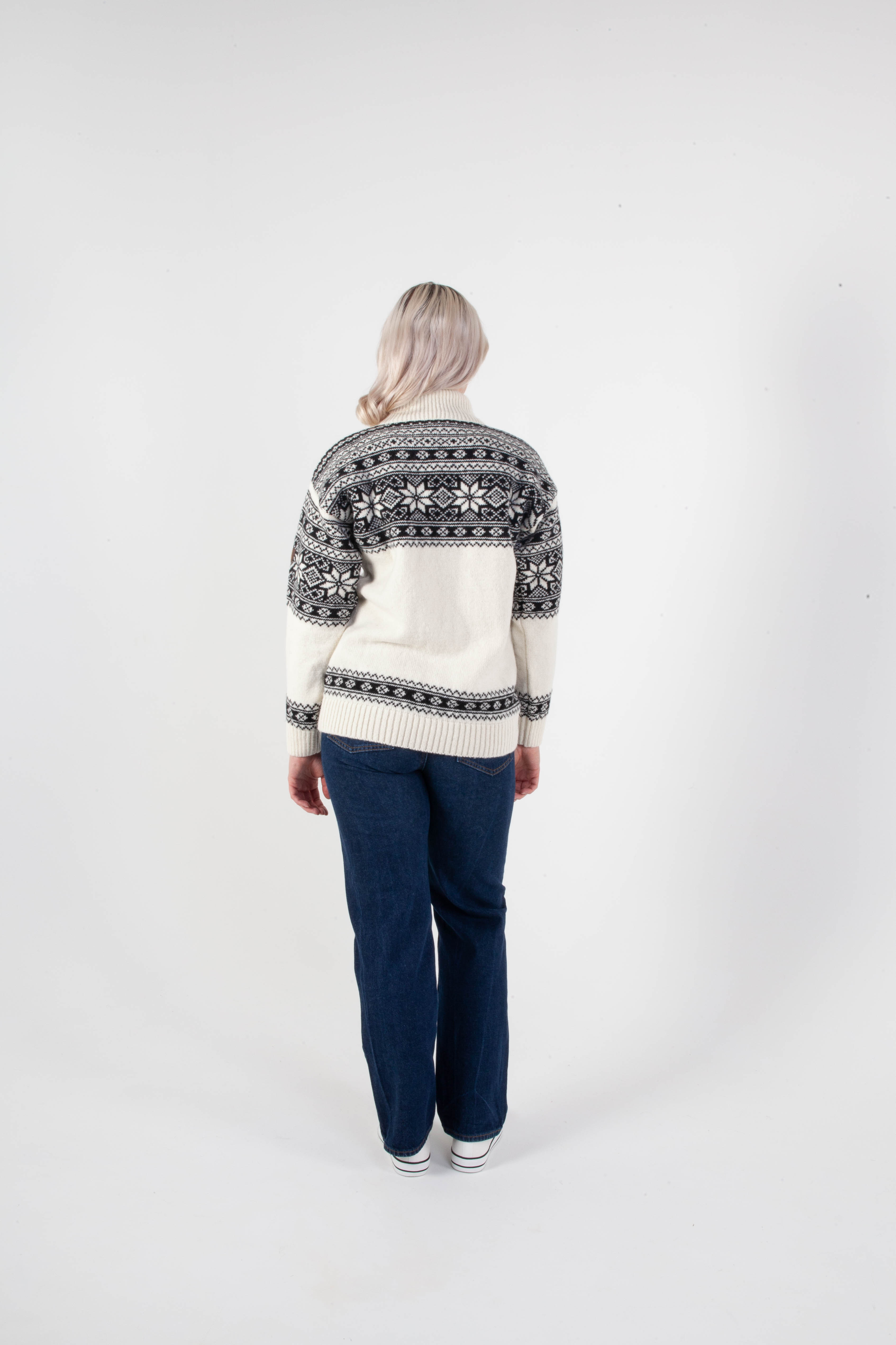 Snøstjerne-genseren er en varm ullgenser laget av 100 % norsk ull. Genseren har høy hals med glidelås og behagelig fleecefôr inni halsen. Mønsteret har vært brukt i tradisjonell norsk strikking i lang tid. Historien går helt tilbake til 1800-tallet. Vi har laget vår vri av det vakre mønsteret på Snøstjerne-plaggene inspirert av det gamle strikkemønsteret. Unisex modell basert på herrestørrelse, anbefaler damer å gå ned en størrelse enn det man vanligvis bruker.