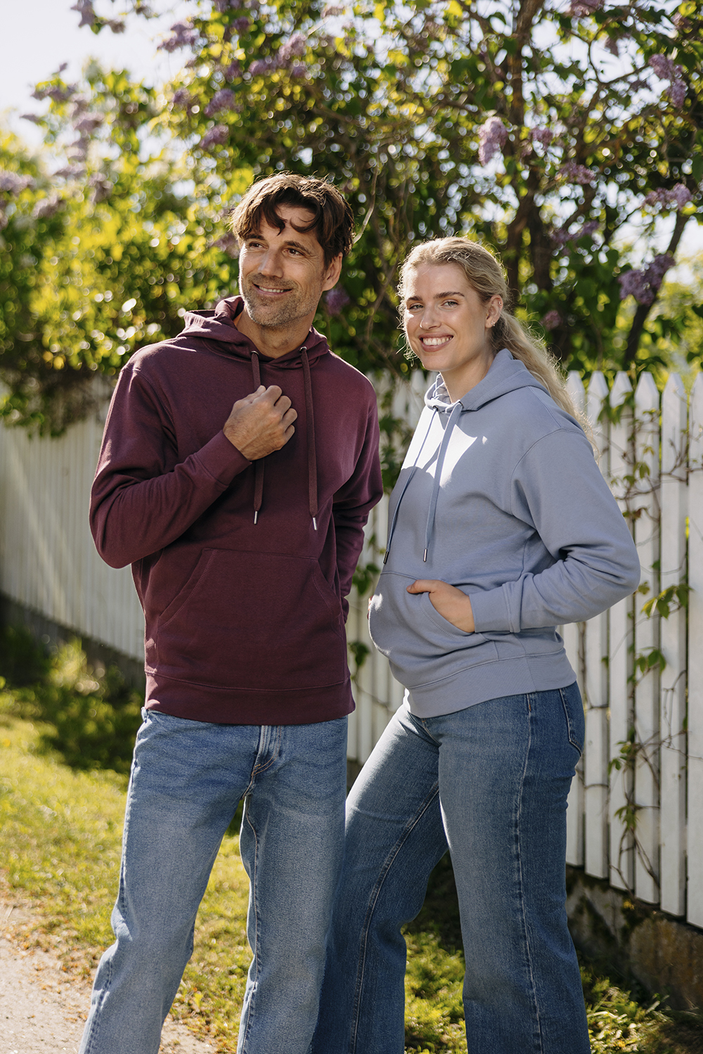 Klassisk unisex hettegenser i 80% økologisk bomull og 20% resirkulert polyester. GOTS-sertifisert CU 1298291. Dobbel jerseystrikket, flosset innside, forsterkede sømmer. Dobbel hette med snøring. Stikklomme i front.  Modellen har en litt smalere passform enn 3851 Harlem.