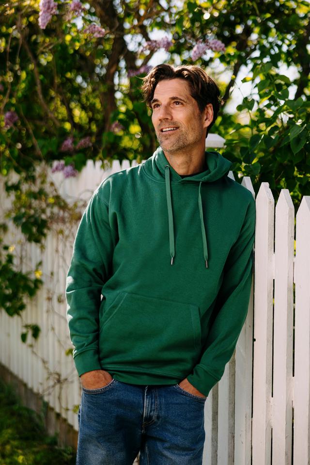 Klassisk unisex hettegenser i 80% økologisk bomull og 20% resirkulert polyester. GOTS-sertifisert CU 1298291. Dobbel jerseystrikket, flosset innside, forsterkede sømmer. Dobbel hette med snøring. Stikklomme i front.  Modellen har en litt smalere passform enn 3851 Harlem.