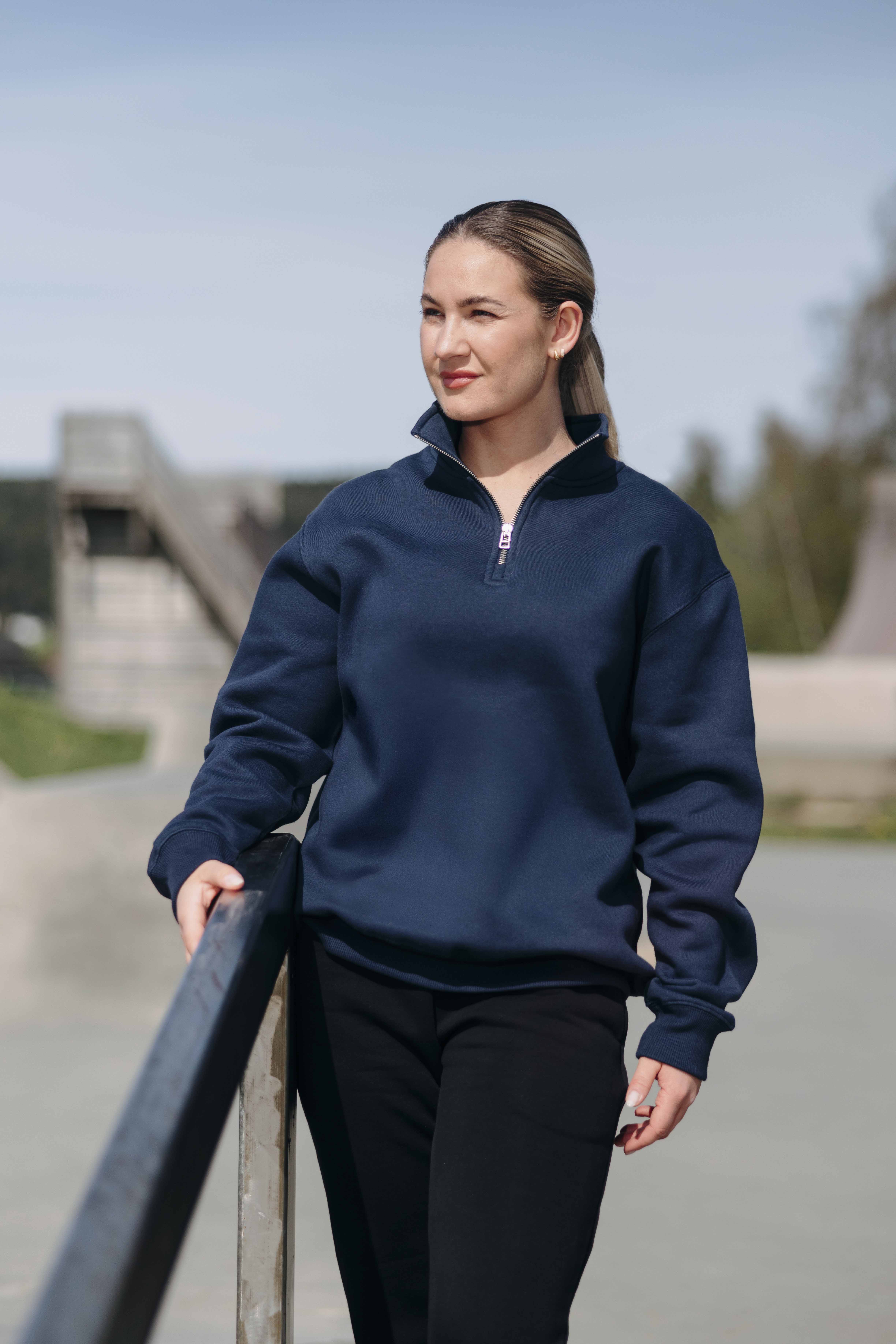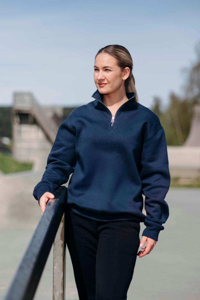 Unisex zip-genser i økologisk bomull og en blanding av resirkulert bomull og polyester, med børstet innside. Med en løsere A-formet silhuett gir den en avslappet passform, komfort og stil. En god klassiker som kan kombineres med både jeans, joggebukse og shorts. No label. Kortreist produksjon fra Portugal, hvor fabrikken drives på 40% solenergi. OCS/RCS-sertifisert CU 1298291.