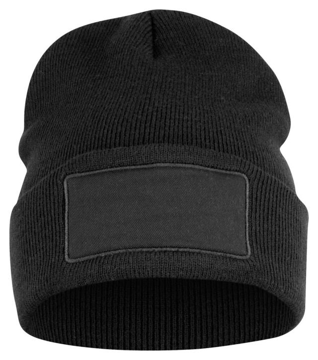 Strikket lue med oppbrett, med felt til å trykke på. Patch i front til logotrykk: 9,5 x 4,5 cm.