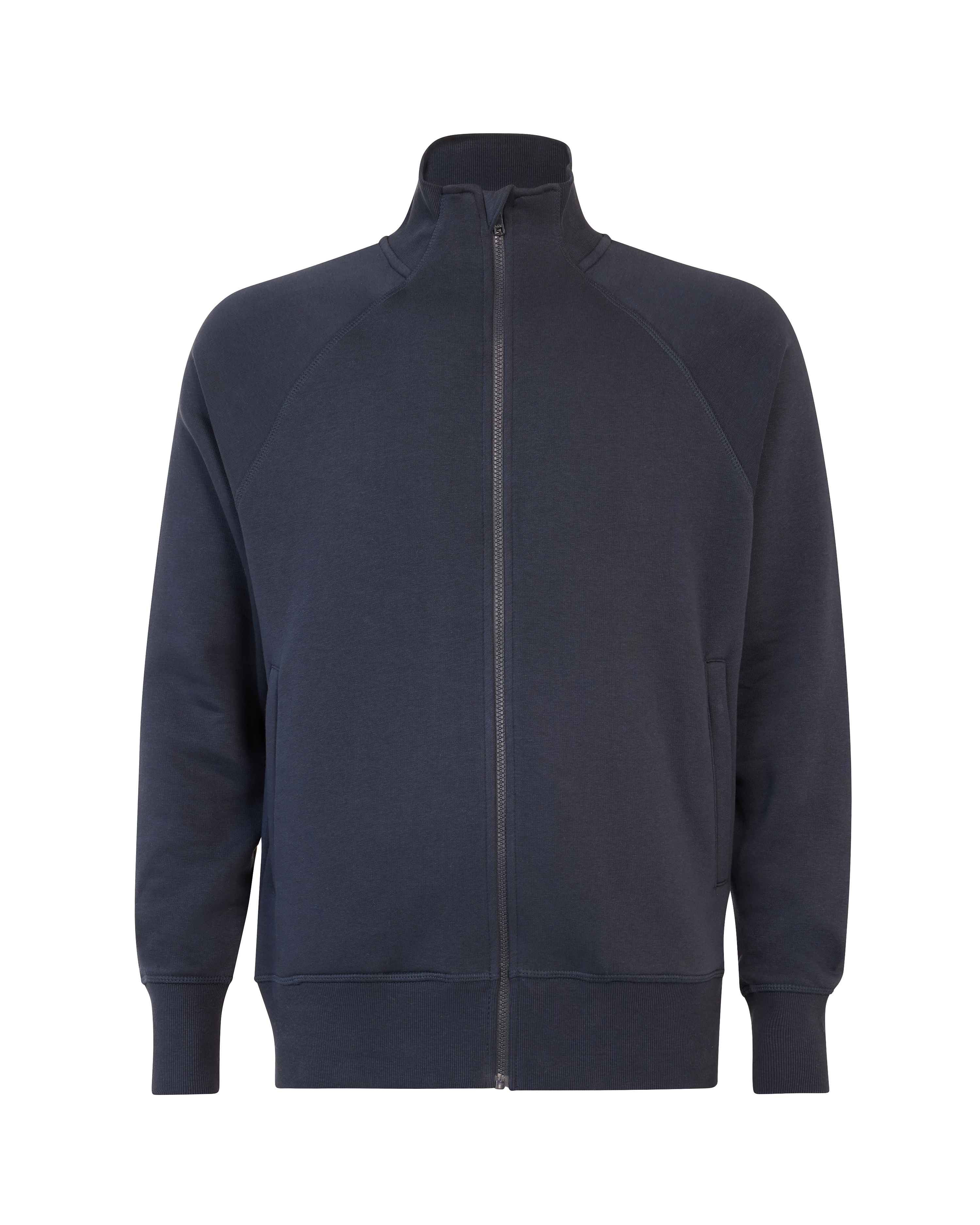 Denne klassiske sweatshirt-jakken uten hette er laget i en kraftig og behagelig kvalitet som gir både komfort og slitestyrke. Den har en hel ton-i-ton YKK-glidelås i front og to praktiske sidelommer, også med YKK-glidelås, som gjør det enkelt å oppbevare småting trygt. Jakken er utstyrt med strikket krage og raglan-ermer som gir god bevegelighet, samt en flosset innside som føles myk mot huden. Det forsterkede nakkepartiet sørger for ekstra holdbarhet, mens ribb i mansjetter og nederkant gir en god passform. Jakken er produsert i BCI-sertifisert bomull, noe som gjør den til et mer bærekraftig valg.
