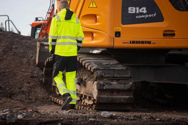 Den fluoriserende fargen og de strategisk plasserte refleksdetaljene sikrer høy synlighet i henhold til EN 20471 klasse 3, den høyeste sikkerhetsklassen for synlighetsbekledning. Jakken har en værbeskyttende membran som gir vind- og vanntette egenskaper, samtidig som den puster godt for økt komfort gjennom hele arbeidsdagen.