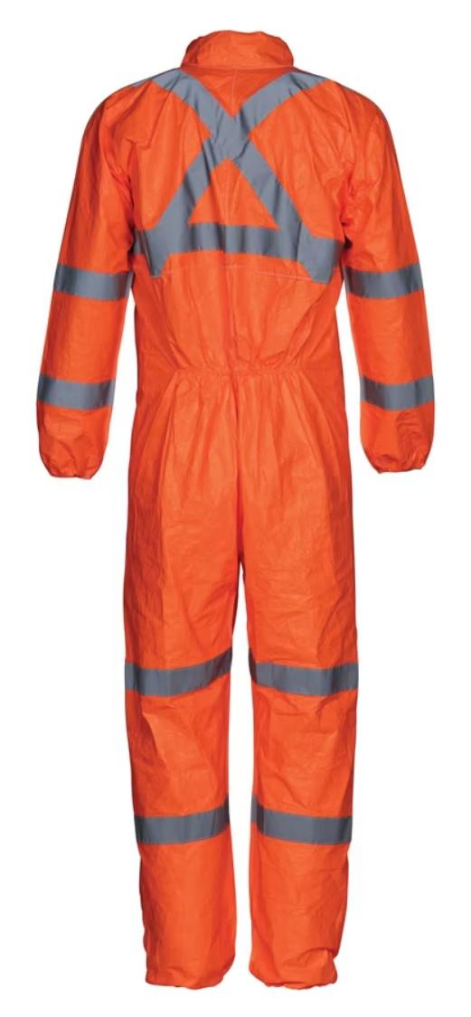 Materialet er laget av flashspunnet polyetylen som gir en balansert kombinasjon av beskyttelse, slitestyrke og komfort. Den ikke-vevde strukturen slipper gjennom luft og vanndamp, men avviser vannbaserte væsker og aerosoler. Vernedressen fungerer som en effektiv barriere mot fine partikler og fibre, er svært lo-fattig og har antistatisk behandling på innsiden. Den sterke oransje fargen i kombinasjon med reflekser gjør brukeren godt synlig under alle lysforhold.